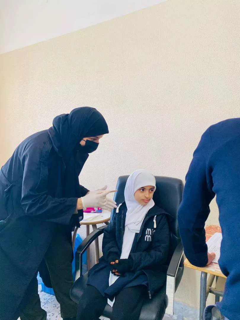 حيث تمت زيارة مدرسة محمد جمال الذرة ببلدية الأصابعة، تحت إشراف عميد الكلية ومدير العيادات بالكلية، وبمشاركة عضو هيئة التدريس الدكتورة عواطف المقطوف، وأطباء الامتياز بالكلية الذين كانوا في الموعد. وقد تم الكشف على حوالي 140 طالبًا، وتقديم النصائح الطبية والإرشادات التوعوية لهم.