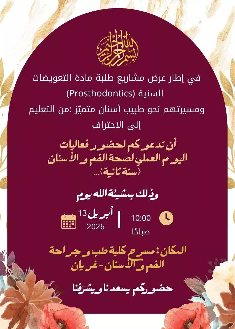 في إطار العمل والتطوير العلمي لكلية طب وجراحة الفم والأسنان، نظم يوم الاثنين 13.4.2026.قسم التركيبات يومًا علميًا لعرض حصيلة عام كامل من الاجتهاد في تعليم وتدريب الطلاب. وقد شمل هذا اليوم عرضًا للجانب العملي الذي اكتسبه طلاب السنة الثانية، خاصة فيما يتعلق بتعلم خطوات إعداد الأطقم الكاملة، وهو ما بذل فيه الطلاب جهدًا كبيرًا تحت إشراف ومتابعة أعضاء هيئة التدريس بالقسم.